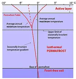 El permafrost es el suelo, roca o sedimento que está congelado durante más de dos años consecutivos. En las zonas no cubiertas por el hielo, existe debajo de una capa de suelo, roca o sedimento, que se congela y descongela anualmente y se denomina «capa activa».[19] En la práctica, esto significa que el permafrost se produce a una temperatura media anual de -2 °C o inferior. El grosor de la capa activa varía según la estación, pero tiene entre 0,3 y 4 metros de espesor (poco profundo a lo largo de la costa ártica, profundo en el sur de Siberia y en la Meseta Qinghai tibetana.[cita requerida]