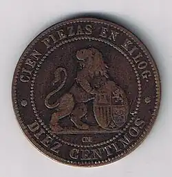Su reverso consistía en un león tenante, sosteniendo el escudo de España (que contiene León, Castilla, Aragón, Navarra y Granada en la punta) y una leyenda que decía "CIEN PIEZAS EN KILOG." y el valor de la moneda "DIEZ CÉNTIMOS". El diseño del reverso fue elegido mediante un concurso, en el que el trabajo presentado por Luis Plañiol, resultó elegido, sirviendo de modelo para el diseño definitivo de Luis Marchionni, que desde 1861 ocupaba el cargo de grabador principal de la Casa de Moneda de Madrid, aunque cabe destacar que la ceca de acuñación fuese la de Barcelona representada con una estrella de ocho puntas.