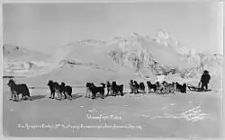 La expedición de Roald Amundsen se planeó en torno a 97 perros esquimales (posiblemente perros esquimales canadienses, perros de Groenlandia o ambos). [28] En su primer intento, dos de sus perros murieron congelados en el −56 °C temperatura. [28] Lo intentó por segunda vez y tuvo éxito. [28] Amundsen estaba cubriendo 27 kilómetros al día, con paradas cada 4.8 kilómetros construir un mojón para marcar el sendero. [28] Llevaba consigo 55 perros, a los que sacrificó hasta que le quedaron 14 cuando regresó del polo. [28] En el viaje de regreso, un hombre esquió delante de los perros y escondió carne en los montículos para animarlos a correr. [28]
