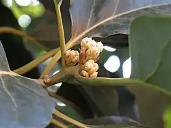 El tronco posee una corteza gris-verdosa con fisuras longitudinales. Las hojas, alternas con pecíolo de 2 a 5 cm y limbo generalmente glauco por el envés. Estrechamente elípticos, ovados u obovados de 8 a 20 cm por 5 a 12 cm y son coriáceos, de color verde y escasamente pubescentes en el haz, aunque muy densamente por el envés, que es de color marrón amarillento y, donde resalta el nervio central. Tiene base cuneiforme y ápice agudo. Los márgenes enteros y más o menos ondulados.
