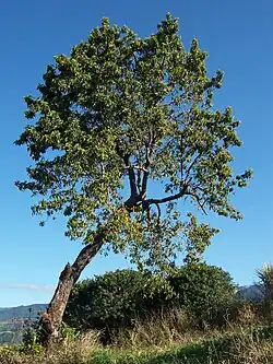 En estado silvestre, el árbol puede alcanzar alturas de alrededor de 20 m, más comúnmente entre 8 y 12 m, y un diámetro a la altura del pecho de 30-60 cm, con tronco erecto o torcido. Los árboles en plantación, generalmente derivados de injertos y sujetos a podas de formación, muestran una apariencia muy distinta. Copa: extendida, globulosa o acampanulada, con ramas bajas, ramas jóvenes al principio, de color verde amarillento, que después se tornan opacas y con cicatrices prominentes dejadas por las hojas. Corteza: áspera, a veces surcada longitudinalmente.[17]