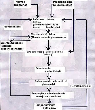 En el curso de la enfermedad pueden actuar diferentes factores (p.ej. sexualidad incipiente, problemas coyunturales, psicoterapias inapropiadas) que retraumatizan con un efecto de feedback negativo. Además de esto, se desarrollan conductas autolesivas ideadas como intentos de solución al problema.