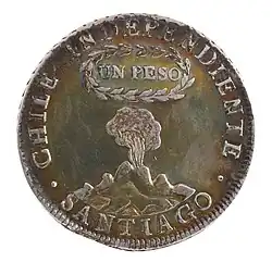 El diseño del reverso de la moneda, por clara influencia de O'Higgins, incluía un volcán en erupción como representación de la energía de la nueva nación,[9] y el valor facial de un peso entre una corona de laureles.[6] Esta guirnalda, figura constante en la numismática chilena, representaba el triunfo o fama debido al verdor perpetuo de sus hojas, que implicaban una victoria imperecedera.[11] Un elemento central de la moneda es la enseña chile independiente, ubicada en el exergo superior, y que simbolizaba la soberanía y distinción frente al antiguo poder imperial.[6] En la parte inferior del volcán, la palabra santiago hacía referencia al lugar de acuñación, la Casa de Moneda de dicha ciudad.[3]