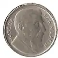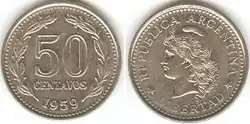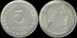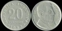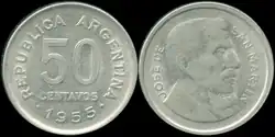 En 1950 aparece una nueva acuñación, en un principio de cuproníquel, y luego de acero enchapado, conmemorando el aniversario de la muerte de José de San Martín. Esta serie de monedas, con valores de 50, 20, 10 y 5 centavos, continuó hasta 1956.