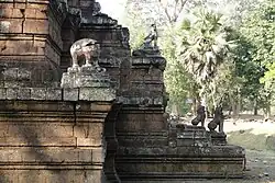 Las escaleras de subida al templo estaban flanqueadas por estatuas de leones, y en las esquinas hubo también esculturas representando elefantes.