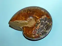 Concha fósil del género Phylloceras, con una parte retirada para revelar las suturas. | ||