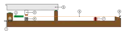 1. Pasador de afinación / 2. Amortiguador/ 3. Tangente / 4. Yunque / 5. Tecla / 6. Cuerda / 7. Pastilla micrófono / 8. Cordal