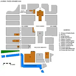 - ↑ Delante del Palazzo Comunale y el Palazzo della Dogana, donde antiguamente había un pequeño plaza, la plaza recibía nombre distintos.