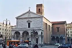 Los desastrosos bombardeos del 1943-1944 redujeron a la Catedral, los Tre Palazzi y el Palazzo Granducale a un montón de ruinas, mientras que todos los edificios a su alrededor sufrieron grandes daños, empezando por la vecina iglesia de Santa Giulia, construida a partir de 1602 al borde de la plaza. A pesar de que tres de los cuatro pórticos atribuidos a Alessandro Pieroni, sostenidos por ligeras arcadas de medio punto sobre columnas toscanas, resistieron en buena parte a la fuerza de las bombas, no se salvaron de la reconstrucción postbélica, cuando fueron definitivamente demolidos, con excepción de la logia del noreste.