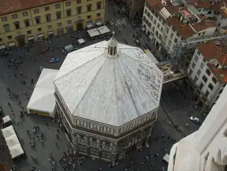 El Baptisterio de San Juan (Battistero di San Giovanni) es un edificio de origen paleocristiano, construido probablemente sobre cimientos del siglo V, que ha llegado inmutado hasta nuestros días, aunque embellecido con numerosos adornos exteriores e interiores. Los mármoles de color blanco y verde del exterior datan del siglo XI, en pleno estilo románico. En el interior, a su vez, están presentes mosaicos y frescos de gran valor del siglo XIII florentino: parece que participaron en su realización Cimabue y Coppo di Marcovaldo, mientras que para los mosaicos quizá trabajaron maestros vénetos. Las tres célebres puertas datan del siglo XIV-XV.