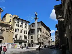 En el centro de la plaza está la Colonna della Giustizia, una poderosa columna de granito oriental que proviene de las Termas de Caracalla, la última conservada intera entre las ruinas de dicho complejo termal,[1] donada por el Papa Pío IV (de una rama lombarda de la familia Médici) en 1563 a Cosme I, el primer gran duque de la ciudad. En 1581 se añadió la estatua de la Justicia en la cima de la columna, por la que recibe su nombre actual. En estos mismos años se encargó a Bartolommeo Ammannati reconstruir el Ponte Santa Trinita para celebrar la victoria sobre Siena.