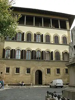 Entre los numerosos edificios del siglo XV que rodean la plaza, destaca en la esquina sudeste el palazzo Guadagni, construido por Cronaca para la familia Dei en torno a 1505, que presenta una logia en la última planta, una característica entonces innovadora que fue copiada por numerosos otros palacios nobiliarios de la ciudad. Las ventanas tienen particulares cornisas con claves con forma de gota. Antiguamente la primera y la segunda planta estaban decoradas con pinturas blancas sobre fondo negro, obra de Andrea del Sarto, pero lamentablemente se han perdido. En 1914 se inauguró en la planta baja la primera biblioteca municipal de Florencia, dedicada a Pietro Thouar, que se trasladó en 2015 al complejo de las leopoldinas en la Piazza Tasso.