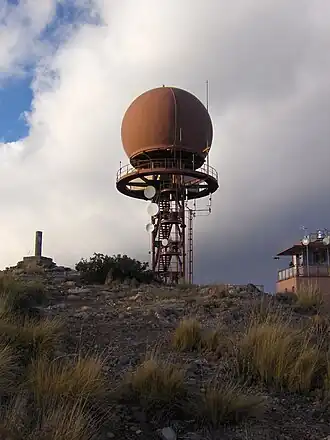 Cima del pico, en la que se ven el vértice geodésico y el radar | ||