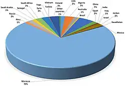 Los países con las mayores reservas de roca de fosfato son (en miles de millones de toneladas métricas): Marruecos 50, China 3.1, Argelia 2.2, Siria 1.8, Finlandia 1.6, Sudáfrica 1.5, Rusia 1.3, Jordania 1.2, Egipto 1.2, Australia 1.1, Estados Unidos 1.1.[21][16]