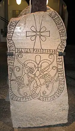 - "Ragnfríðr hizo erigir esta piedra en memoria de Bjôrn, su hijo y el de Ketilmundr's. Que Dios y la madre de Dios ayuden a su espíritu. Él cayó en Virland. Y Ásmundr lo marcó."