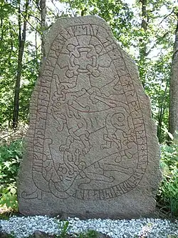 - "Ragnfríðr hizo erigir esta piedra en memoria de Bjôrn, su hijo y el de Ketilmundr. Él cayó en Virland. Que Dios y la madre de Dios ayuden a su espíritu. Ásmundr marcó las runas correctas."