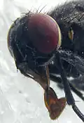 Las piezas bucales de los insectos que se alimentan de los fluidos son modificados de diversas maneras para formar un tubo a través del cual el líquido pueda mezclarse en la boca y por lo general otra a través del cual pasa la saliva. Los músculos de la faringe o cibarium se desarrollan fuertemente para formar una bomba. En moscas no-mordedoras, las mandíbulas están ausentes y otras estructuras se reducen.; los palpos labiales se han modificado para formar el labelo y los palpos maxilares están presentes, aunque a veces corto. En Brachycera, el labelo es especialmente destacado y utilizarse para la esponja alimento líquido o semilíquido.[7] El labelo es una estructura compleja que consta de muchos surcos, llamado pseudotrachea, que son líquidos o secreciones salivales de la labella ayudar a disolver y recoger las partículas de alimentos para que puedan ser más fácilmente absorbidos por el pseudotracheae; esto se cree que se producen por la acción capilar. El alimento líquido se extrae a continuación, a partir de la pseudotracheae a través del canal de alimentación en el esófago.[10] Las piezas bucales de las abejas son de masticación y de recubrimiento para la succión. El pulido es un modo de alimentación en la que el líquido o semilíquido adherente de alimentos a un órgano protrusible, o "lengua", se transfiere de sustrato a la boca. En el abeja de la miel (Hymenoptera: Apidae: Apis mellifera), forman el glosas labial alargada y fusionado una lengua vellosa, que está rodeado por el maxilar galeae y los palpos labiales para formar una trompa tubular que contiene un canal de alimentación. En la alimentación, la lengua se sumerge en el néctar o miel, que se adhiere a los pelos, y luego se retrae de manera que el líquido adherido se realiza en el espacio entre la galeae y palpos labiales. Este movimiento glossal de ida y vuelta se produce repetidamente. Movimiento de líquido a la boca resulta aparentemente de la acción de la bomba cibarial, facilitado por cada uno de retracción de la lengua empujando líquido hasta el canal de alimentos.