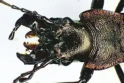 Los insectos masticadores tienen dos mandíbulas, una a cada lado de la cabeza. Las mandíbulas están colocadas entre el labro y las maxilas. Las mandíbulas cortan y trituran los alimentos, y pueden ser utilizados para la defensa; en general, tienen un borde de corte apical, y la zona de los molares más basales muele la comida. Pueden ser extremadamente duras (alrededor de 3 en Mohs, o una dureza de penetración de alrededor de 30 kg / mm 2 ). Por lo tanto, muchas termitas y escarabajos no tienen ninguna dificultad física en perforar a través de láminas fabricadas con metales comunes como el cobre, el plomo, el estaño y el zinc.[5] Suelen reforzarse mediante la adición de zinc, manganeso, o rara vez, el hierro, en cantidades de hasta un 4% del peso seco.[6] Por lo general son las piezas bucales más grandes de los insectos masticadores, que se utilizan para masticar (corte, desgarro, aplaste, mastique) productos alimenticios. Se abren hacia el exterior (a los lados de la cabeza) y se unen medialmente. En insectos masticadores carnívoros, las mandíbulas pueden ser modificados para ser más similar a un cuchillo, mientras que en los insectos masticadores herbívoros son más típicamente ancho y plano en sus caras opuestas (por ejemplo, orugas). En los escarabajos ciervo machos, las mandíbulas se modifican en un grado tal que no sirven ninguna función de alimentación, sino que se utilizan para defender los sitios de apareamiento de otros machos. En hormigas, las mandíbulas también cumplen una función defensiva (en particular en las castas de soldado). En las hormigas toro, las mandíbulas son largas y dentada, utilizadas como apéndices para la caza y defensa.