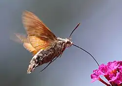 En especies de lepidópteros, que consta de dos tubos unidos por ganchos y separable para la limpieza. Cada tubo es cóncava hacia dentro, formando así un tubo central a través del cual se aspira la humedad. La aspiración se realiza a través de la contracción.[7] Ellos brillan y cinco segmentados en algunas de las familias más basales, y con frecuencia se doblan. El. forma y dimensiones de la probóscide han evolucionado para dar diferentes especies de más amplia y por lo tanto, las dietas más ventajosas[7] Hay una alométrico relación de escala entre la masa corporal de los lepidópteros y la longitud de la probóscide[8] de la que una salida de adaptación interesante es la inusualmente larga de lengua polilla halcón Xanthopan morgani praedicta. Charles Darwin predicho la existencia y la probóscide longitud de esta polilla antes de su descubrimiento basado en su conocimiento de la tan estimulado orquídea estrella de Madagascar Angraecum sesquipedale[9]