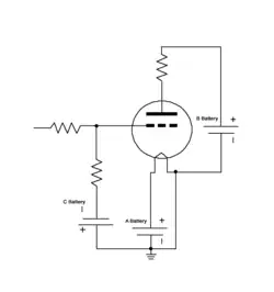 Inicialmente, el único dispositivo fue un fanotrón con un filamento (cátodo) y una placa (ánodo). A raíz de la dirección del flujo de electrones, estos electrodos fueron identificados como "A" y "B", respectivamente y por tanto, se refiere a las pilas (Pila "A" y Pila "B"). Más tarde, la "rejilla de control" fue añadida para crear el tubo triodo, y se le designó la letra "C" y suministradas a través de una pila "C". La posterior adición de nuevos elementos internos para mejorar el rendimiento del triodo, no requerían una ampliación de esta serie de pilas.