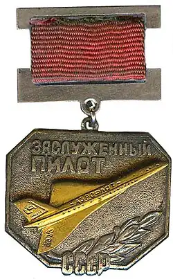 El título de Piloto Honorífico de la URSS, se otorgaba a los pilotos civiles de primera clase por sus logros sobresalientes en el desarrollo de la tecnología aeronáutica, del alto rendimiento en la educación y la capacitación del personal de vuelo y de largos periodos de tiempo sin incidencias en vuelo y por excelentes logros en aviación con respecto a la economía nacional.[1]