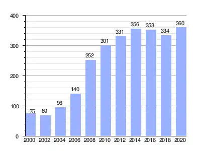 | Gráfica de evolución demográfica de Pinares de Lepe entre 2000 y 2020 |