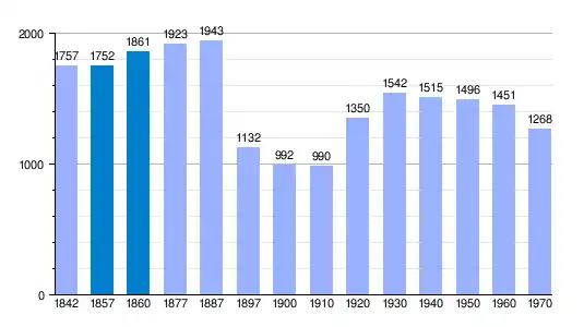 | Gráfica de evolución demográfica de Pinos del Valle[7] entre 1842 y 1970 |