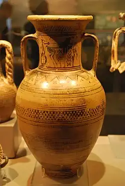 - Borell-Seidel, Brigitte (1978). «Attisch-geometrische Schalen. Eine spätgeometrische Keramikgattung und ihre Beziehungen zum Orient». Keramikforschungen (en alemán) (Maguncia: von Zabern) 2: 44-47. ISBN 3-8053-0237-1.