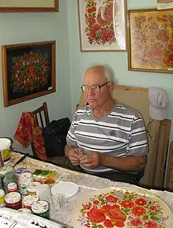 Entre las artistas contemporáneas más activas del estilo Petrykivka se encuentran Halyna Nazarenko, Valentina Panko, Viktoria Timoshenko, Natalia Stativa-Zharko, Olena Yarmoliuk y Natalia Maliarchuk.[25][26][27] La pintura de Petrikivka ha sido a menudo un oficio familiar, y muchos artistas reconocidos (tanto históricos como contemporáneos) suelen tener artistas de renombre en su familia inmediata. Entre las dinastías más famosas se encuentran las de Panko, Pikush, Stativa y Skliar. En algunos casos, estos vínculos no son evidentes, ya que las portadoras de la tradición solían ser mujeres que cambiaban su apellido tras el matrimonio. También se complica por el hecho de que algunos apellidos relativamente inusuales son bastante comunes en el pueblo de Petrykivka, y dos artistas con el mismo nombre de hecho pueden no ser parientes cercanos.[7][9][17]
