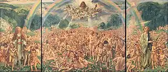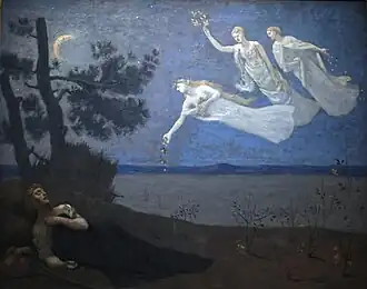 Otro referente avant-la-lettre fue Pierre Puvis de Chavannes, un pintor singular cuyo estilo difiere completamente del simbolismo barroco de Moreau, un estilo clásico y sereno que habría sido clasificado de academicista si no fuese por la elección de sus temas, donde sí se aprecia el recurso al símbolo y la alegoría como medio transmisor del mensaje.[49] Fue un destacado muralista, procedimiento que le venía bien para desarrollar su preferencia por los tonos fríos, que daban apariencia de pintura al fresco. Tenía un estilo más sereno y armonioso, con una temática alegórica de evocación de un pasado idealizado, formas simples, líneas rítmicas y un colorido subjetivo, ajeno al naturalismo.[58] En su juventud pasó brevemente por los talleres de Delacroix, Coutoure y Chassériau y realizó dos viajes a Italia, pero quizá lo más trascendente para la formación de su estilo sereno y reposado fue su relación con la princesa griega María Cantacuzeno, quien le transmitió su intensa espiritualidad.[59] En 1861, con las alegorías de La Guerra y La Paz (Museo Municipal de Amiens) inició su trabajo muralista, del que recibió numerosos encargos por toda Francia y que le haría famoso.[60] Realizó murales en los ayuntamientos de París y Poitiers, el Panthéon, la Sorbona y la Biblioteca Pública de Boston, entre otros. Su estilo monumental se basaba en la ausencia de profundidad, la linealidad constructiva y la majestuosidad compositiva, así como la reflexión filosófica inherente a sus escenas.[61] En 1890 fundó con Rodin, Carrière y Meissonnier la Société Nationale des Beaux Arts, que organizó diversas exposiciones de artistas jóvenes y nuevas tendencias hasta 1910.[62]