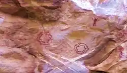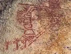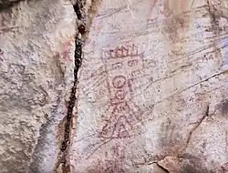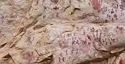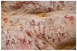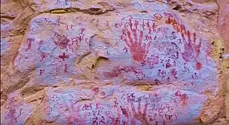 Este sitio arqueológico concentra una gran cantidad de figuras de personas, animales, herramientas, símbolos, manos y representaciones de experiencias vividas por los antiguos nómadas como cazando animales, que dejaban como mensaje o recuerdo para otras personas o generaciones, distribuidas en una pared de roca. Junto a las improntas de las manos existen algunos personajes esquematizados, plasmados en color rojo claro, a diferencia de las manos representadas en color rojo o marrón oscuro.[1]