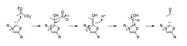 El cofactor tiamina pirofosfato TPP es necesario para este mecanismo de reacción, actúa como grupo prostético de la enzima. El átomo de carbono entre los átomos de azufre y nitrógeno en el anillo tiazol actúan como un carbanión que une al piruvato. La TPP tiene un H+ acídico en su carbono 2 que actúa como parte funcional del anillo tiazolium. Este anillo actúa como un sumidero de electrones, permitiendo a los electrones del carbanión ser estabilizados por resonancia.[2] La TPP entonces puede actuar como un nucleófilo con la pérdida del hidrógeno del C2, formando la forma dipolar neutra de la TPP. Esta forma puede atacar al piruvato que está sujetado por la enzima piruvato decarboxilasa. Durante la decarboxilación del piruvato, la TPP estabiliza los intermedios carbanión como un electrófilo por enlaces no covalentes.[3] Específicamente, el nitrógeno piridilo N1' y el grupo 4'-amino de la TPP son esenciales para la función catalítica del complejo enzima-TPP.[4]