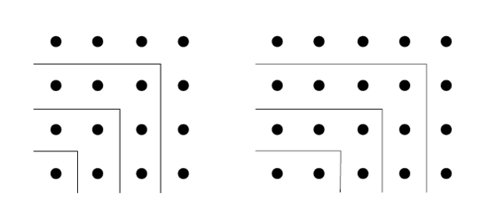 En efecto, si partimos de la unidad y le añadimos los números impares siguiendo el gnomon, obtendremos los números «cuadrados», mientras que si partimos del 2 y le añadimos los números pares, obtendremos los números «oblongos»: