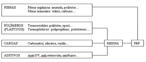 Los plásticos reforzados con fibras ("PRF") están compuestos por un polímero, también llamado "la matriz", que junto a las cargas y aditivos forman la resina y unas fibras determinadas.