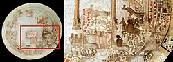 Claude Rapin ha analizado los restos de la placa para intentar una reconstrucción7. Según él, las piezas existentes corresponden a soldados a caballo armados con lanzas, una cuadriga con tres pasajeros coronada por una sombrilla, evidentemente una procesión real, columnas aparentemente independientes que parecen delimitar un espacio, un edificio con techo con pináculos, animales como cérvidos y pavos reales, y plantas.[8]