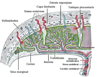 11. Manual Merck de Información Médica para el Hogar (2005). «Embarazo». Sección 22: Problemas de Salud de la Mujer. Archivado desde el original el 13 de enero de 2008. Consultado el 16 de enero de 2008. «Una delgada membrana separa la sangre del embrión que se encuentra en las vellosidades de la sangre de la madre que fluye por el espacio que las rodea (espacio intervelloso). Esta disposición permite el intercambio de materiales entre la sangre de la madre y la del embrión.»