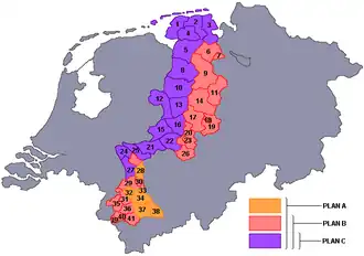 El plan Bakker-Schut. Al oeste, Países Bajos, al este, las zonas alemanas de Baja Sajonia y Westfalia del Norte. Las zonas coloreadas corresponden a los territorios reclamados por los Países Bajos.