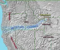 El resultado es un canal de humedad que se extiende desde el Océano Pacífico hasta Yellowstone. La humedad del Océano Pacífico fluye hacia el interior del continente en forma de nubes y aire húmedo. Pasa a través de la brecha entre la Sierra Nevada y la cordillera de las Cascadas hacia el interior de la llanura del río Snake, donde se canaliza a través de las Montañas Rocosas, sin mesetas ni cadenas montañosas que impidan su avance.[1]