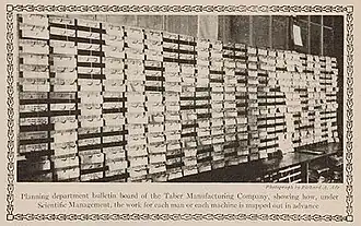 Los métodos y herramientas modernos de planificación de la producción se han desarrollado desde finales del siglo XIX. En la Gestión científica , el trabajo para cada hombre o cada máquina se describe de antemano (ver imagen). Kaplan (1986) resumió que "la demanda de información para la planificación y el control aparentemente surgió en la primera mitad del siglo XX cuando las empresas, como las fábricas de textiles y ferrocarriles, tuvieron que diseñar procedimientos administrativos internos para coordinar los múltiples procesos involucrados en el desempeño de su actividad básica (la conversión de materias primas en productos terminados por las fábricas textiles, el transporte de pasajeros y la carga por los ferrocarriles. " [7]