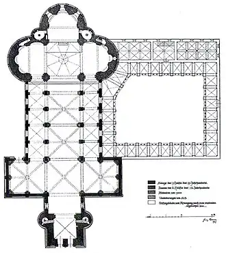 El transepto de la catedral de Nuestra Señora de Tournai tiene una planta similar: dobles ábsides flanqueados por torres. Por tanto, el edificio cuenta con una fuerte influencia de esta planta en su transepto, mientras que la construcción de la nave se inspiró en las catedrales francesas.