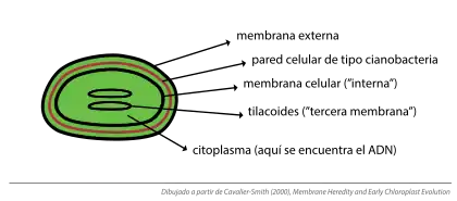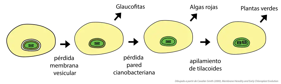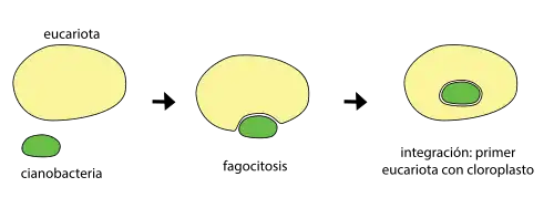 Los demás eucariotas que poseen cloroplastos los adquirieron por engullir a su vez no a una cianobacteria, sino a un "alga verde" o alga roja que ya tenían cloroplastos (los adquirieron "por endosimbiosis secundaria"). Por lo tanto, los cloroplastos son todos derivados de una única cianobacteria que fue la primera en ser incorporada como cloroplasto, pero los eucariotas que los poseen, al haber realizado la endosimbiosis varias veces independientemente, no están relacionados filogenéticamente.