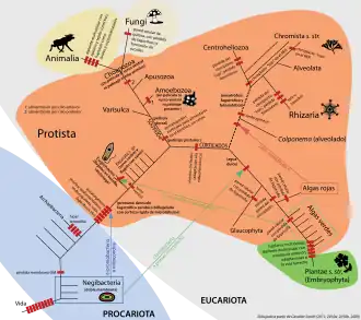 - ↑ Cavalier-Smith, T. 2010b. «Kingdoms Protozoa and Chromista and the eozoan root of the eukaryotic tree.» Biol. Lett.