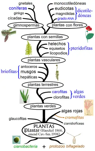 | Plantae sensu lato | Primoplantae o Archaeplastida | De adquisición primaria de cloroplastos: plantas verdes, algas rojas y glaucofitas | Cavalier-Smith 1998, Baldauf 2003[7] |