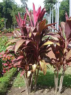 La planta de ti (Cordyline fruticosa) es una planta con forma de palma que crece de 3 a 4 m (9.8 a 13.1 pies) de altura, con un atractivo grupo de hojas ampliamente alargadas en forma de abanico y en espiral en la punta de sus troncos delgados. Tiene numerosas variaciones de color, que van desde plantas con hojas rojas hasta cultivares verdes, amarillas y abigarradas. Se desconoce su distribución nativa original, pero se cree que es nativa de la región que va desde Bangladés, hasta el sudeste asiático continental, el sur de China, Taiwán, la isla del sudeste asiático, Nueva Guinea y el norte de Australia. Tiene una mayor diversidad morfológica en Nueva Guinea y se cree que se ha cultivado allí extensamente. Es comúnmente identificada erróneamente como "Dracaena", junto con miembros del género Cordyline, debido a sistemas de clasificación pasados.[91][92]