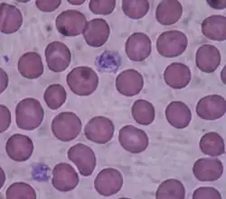 Dos plaquetas (púrpura) bajo el microscopio de luz (40x) de un frotis de sangre periférica rodeada por eritrocitos.