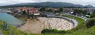 Presenta forma de concha, limitada al oeste por la punta de San Pedro.[3] La playa está junto a los restos del castillo de Llanes, de los que queda en pie el conocido como Torreón de Llanes.[1] Presenta todo tipo de servicios, desde aseos, duchas, papeleras, servicio de limpieza, o teléfonos, a oficina de turismo, establecimientos de comida y bebida, y alquiler de sombrillas.[2]
