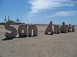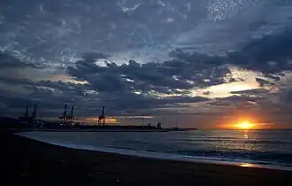 ![]() Vista de la playa al amanecer con las grúas del puerto. | ||