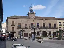 En el lado este, uno de los menores, se levanta el Ayuntamiento, edificio que ha sufrido numerosas transformaciones. Una de las más importantes fue la que llevó a cabo en 1865 el arquitecto Cirilo Varas y Soria. Restaurado en 1967 con el conjunto de la plaza, ofrece una elegante fachada de piedra sillar, con tres puertas y ventanas enrejadas en la planta baja y en la principal balcón corrido con cinco vanos adintelados, coronado el central por un gran escudo con las viejas armas de la ciudad (las de la encomienda de las casas de Almagro, con la cruz flordelisada de la Orden de Calatrava y en punta las dos trabas negras, insignia del maestre). En el ángulo izquierdo del edificio destaca una pequeña torre aterrazada en la que se encuentra un reloj de forja y de la que sobresale una singular estructura metálica, también de forja, que sostiene la campana, fechada en 1798 y que proviene del antiguo convento de Santa Catalina, de frailes franciscanos.