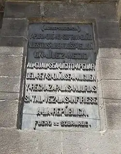 En los laterales del pedestal figuran: un texto de los Fueros de Sobrarbe: "Y para que no sufran daño nuestras libertades, velará un Juez medio al cual sea lícito apelar del Rey si dañase a alguien y rechazar las injurias si tal vez las infiriese a la república"; otro de "La capilla de Lanuza" (1871) de Marcos Zapata: "Sol brillante fue la libertad un tiempo, a cuya luz se agrupaban en las márgenes del Ebro los reyes con sus coronas, los vasallos con sus fueros, la nobleza con sus timbres y todos formaban un cuerpo"; en el frontal norte quedan recogidos nombres de unos 50 Justicias del Reino desde 1123.[1]