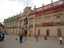 El Palacio Municipal es un edificio ecléctico del siglo XIX. Alrededor de 1593 Juan de Oñate y su sucesor Juan López de Riego construyeron un edificio sencillo para las autoridades. En el mismo sitio llegaron a existir las casas reales, una cárcel, un parián y el palacio episcopal para el obispo Ignacio Montes de Oca y Obregón. En 1915 fue devuelto al ayuntamiento.[8] Frente al palacio municipal se encuentra la escultura El Señor de las Palomas.